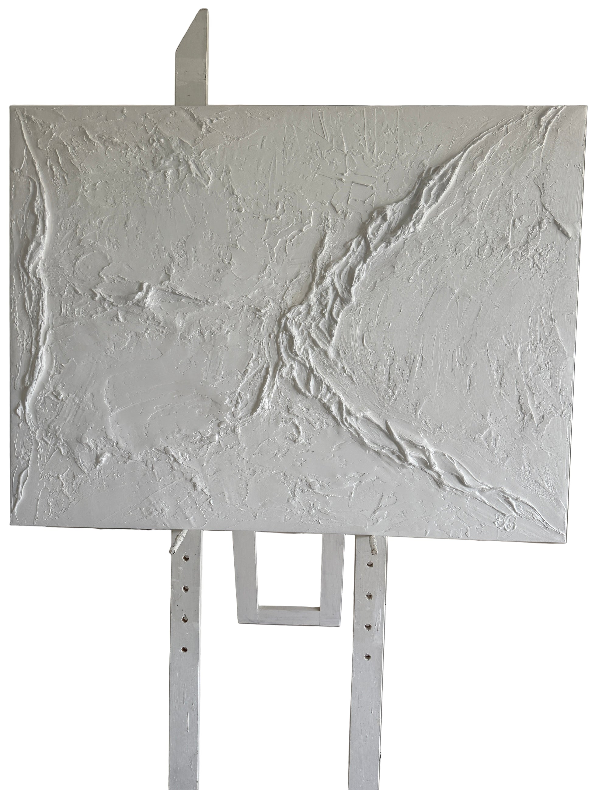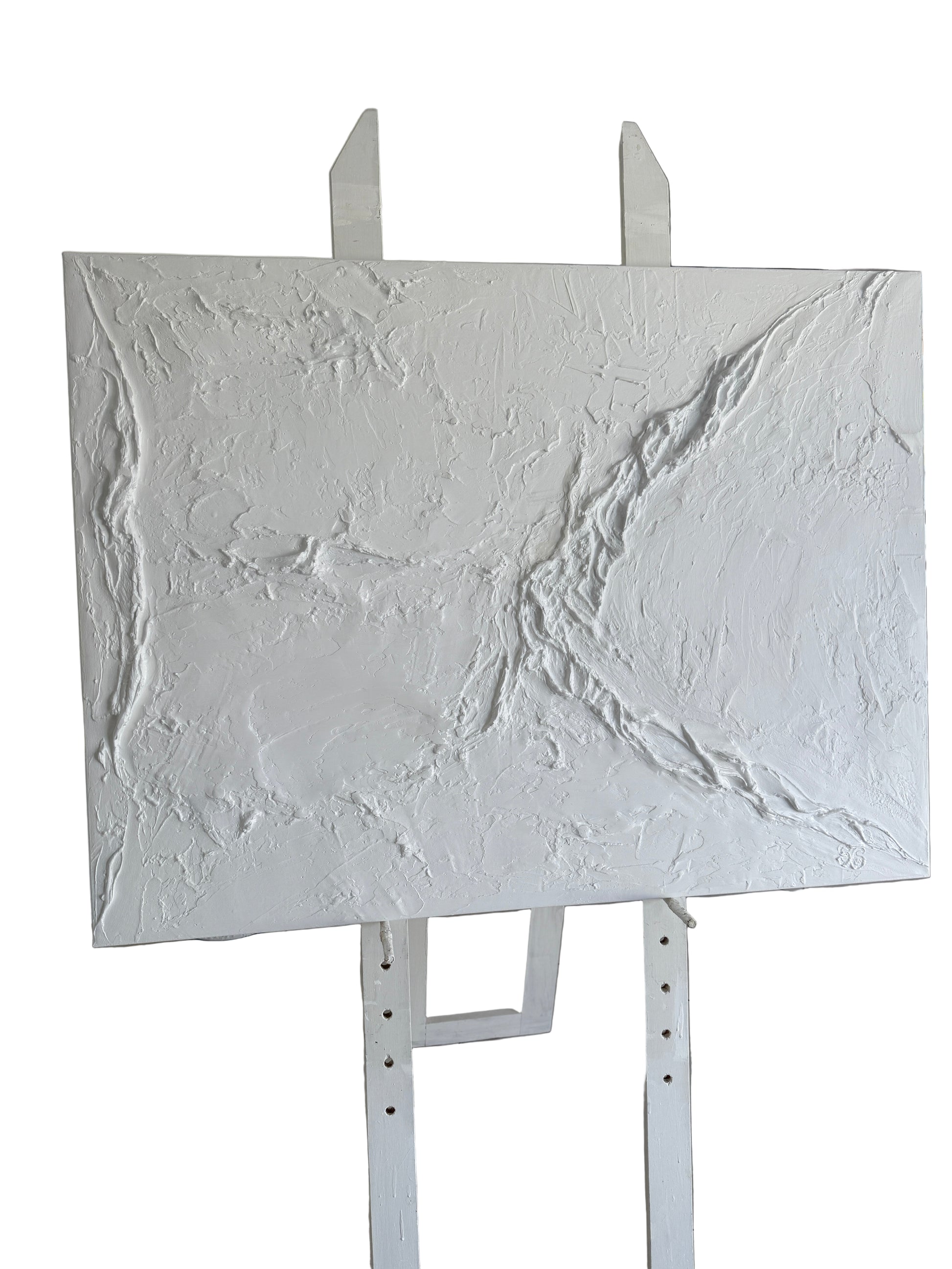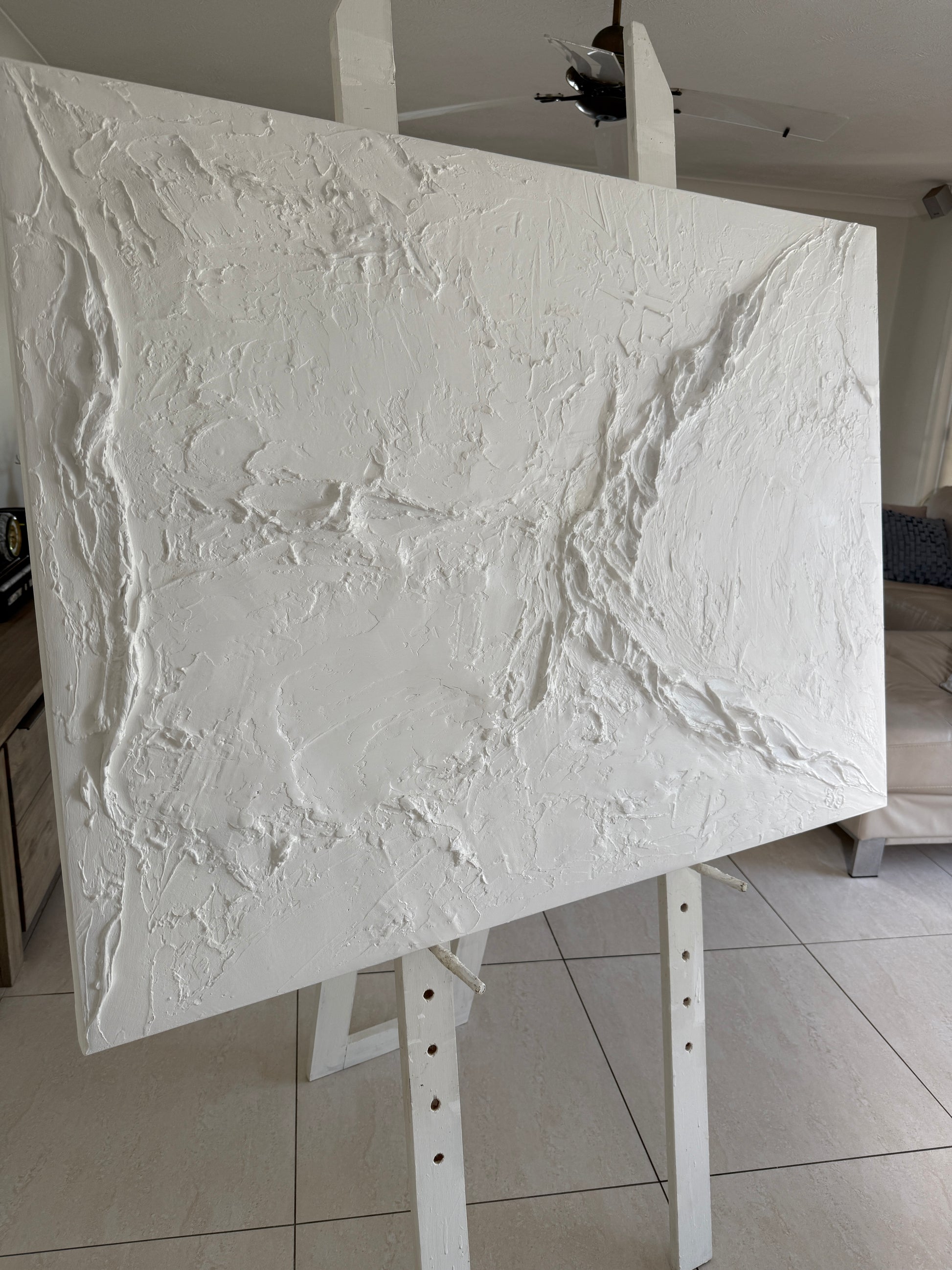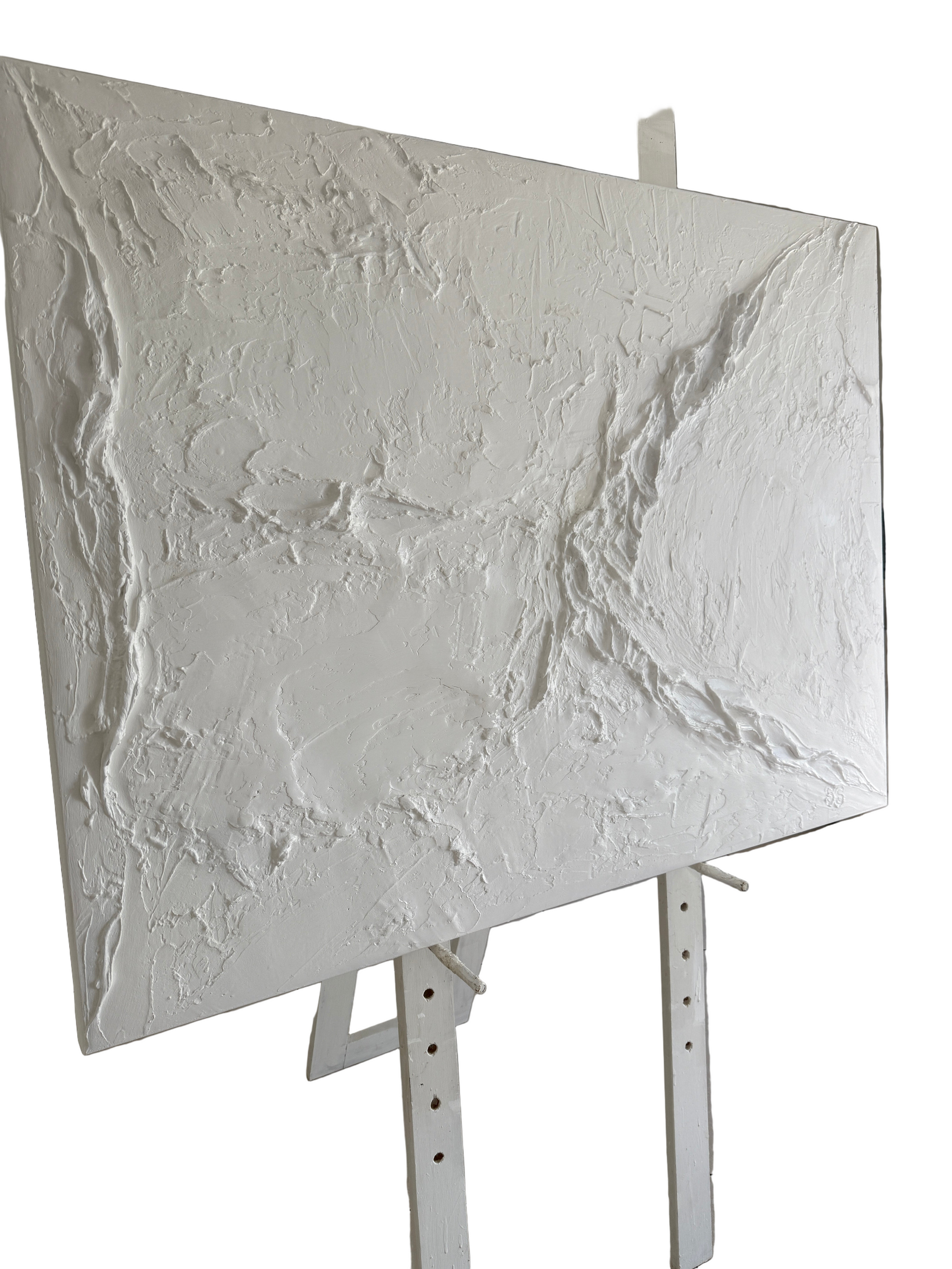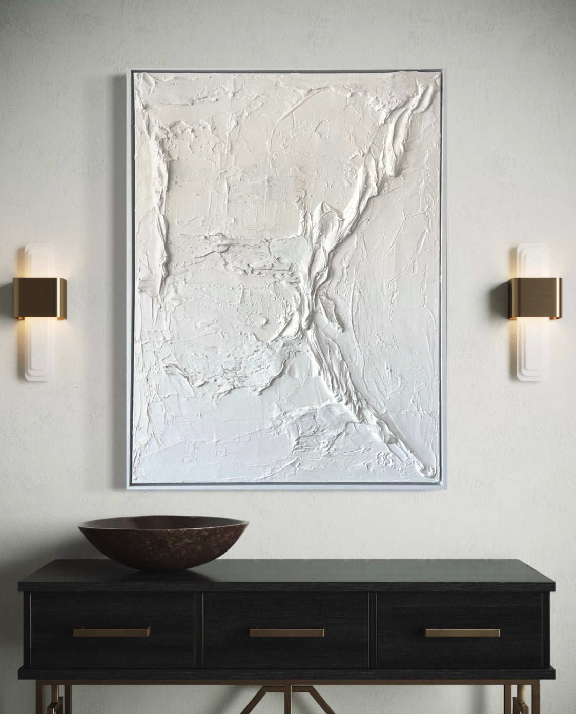This original hand-textured artwork features layered sculptural detailing in pure white, creating a serene yet captivating effect. The organic textures catch the light beautifully, adding movement and dimension to minimalist or modern interiors.