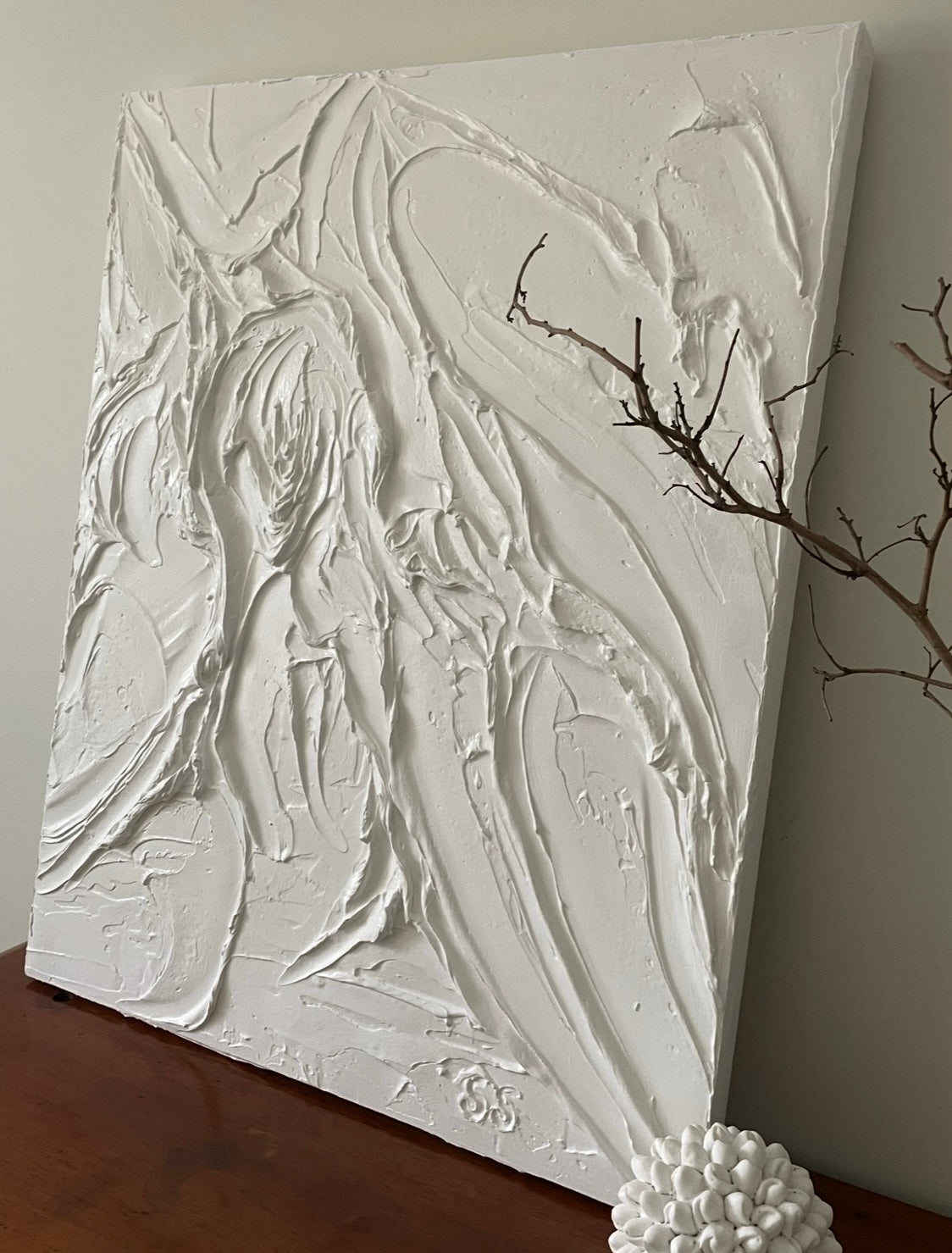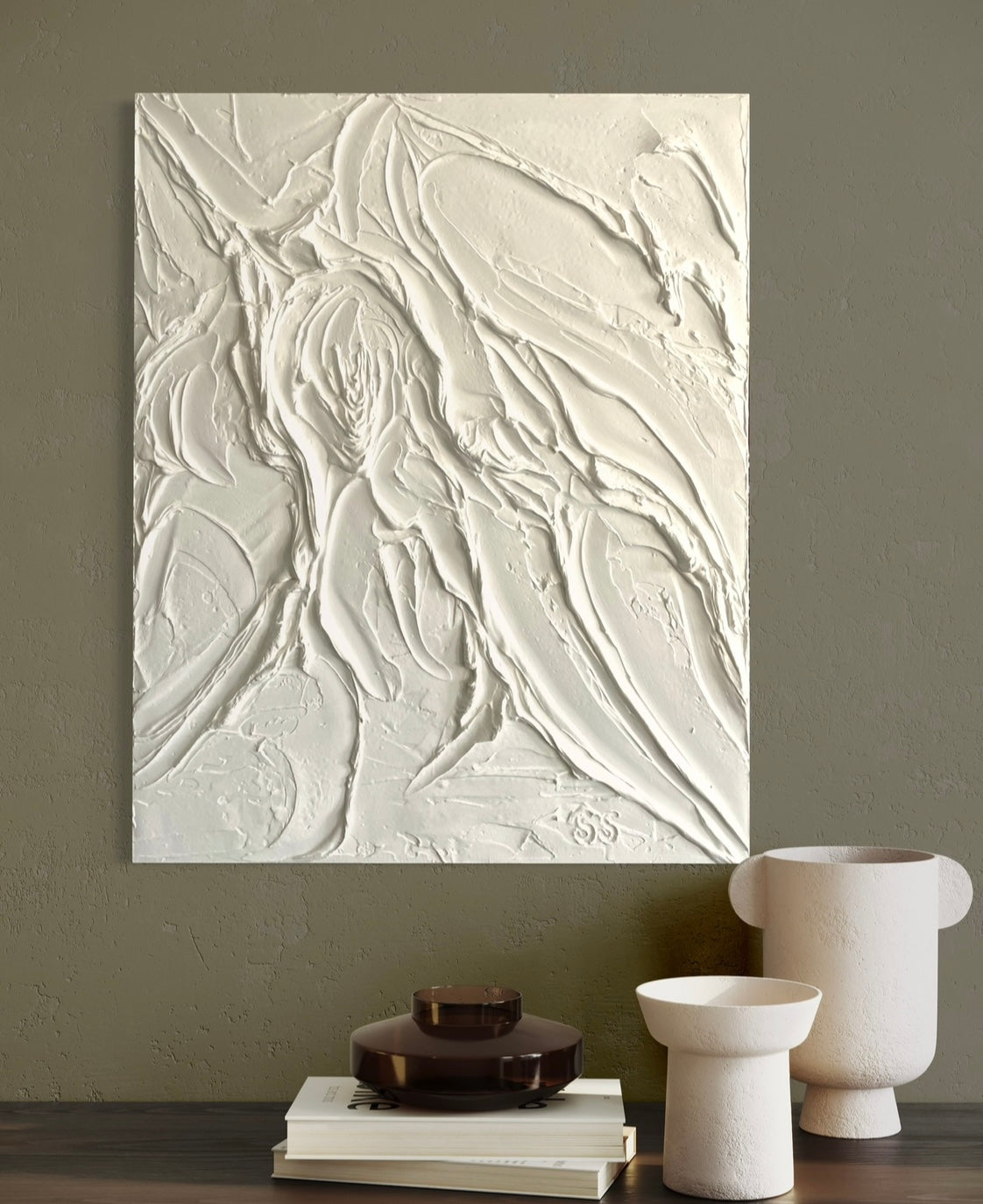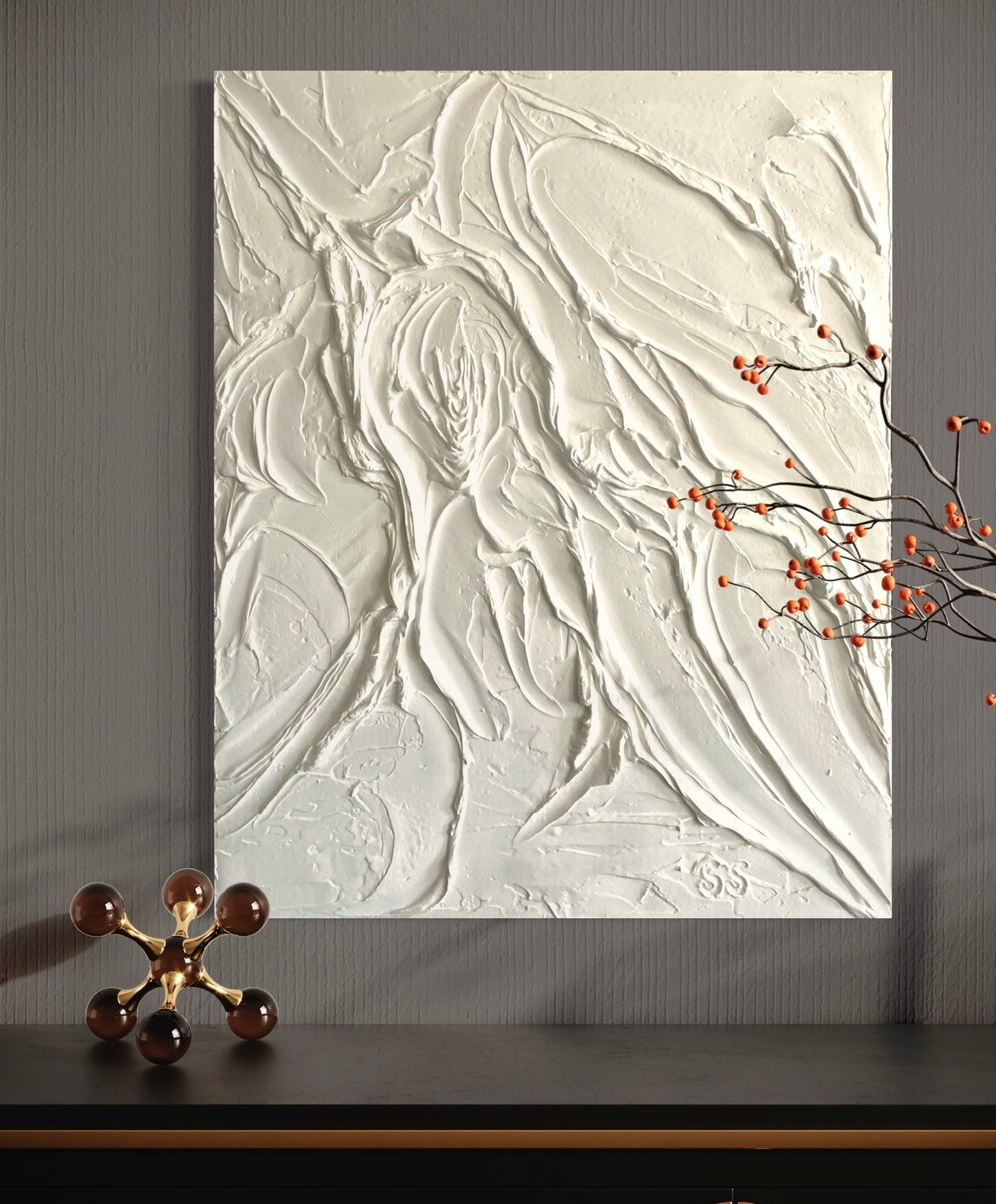 Bring serene sophistication to your space with Whispered Stillness, a contemporary textured artwork hand-sculpted with rich, sweeping layers of white plaster. The organic movement and tonal depth create a minimalist yet captivating focal point — perfectly complementing modern, neutral interiors.